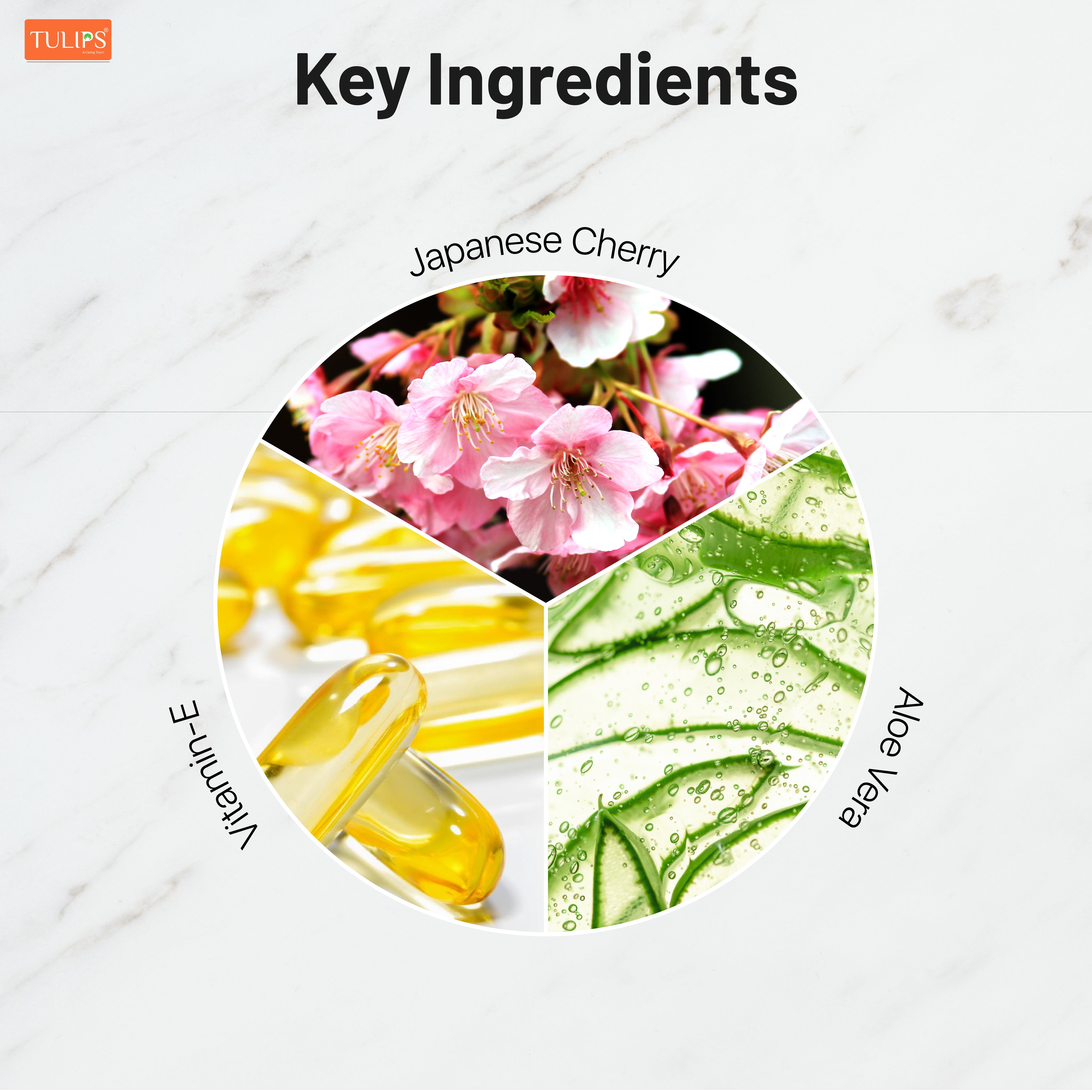 Sodium Stearate, , Propylene Glycol, Sodium Coco ate, Sodium Lauryl Ether Sulfate, Sorbitol, Glycerin, Sodium chloride, Sodium Lauryl Sulfate, Aqua, Perfume, Japanese Cherry , Vitamin - E , Aleo Vera, Butylated Hydroxy Toluene.